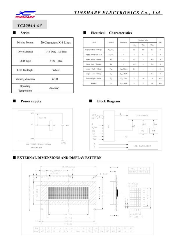 Matryca 20x4 znaków, negatywowa, z podświetleniem , 06:00, -20/+70C, ekran , TinSharp