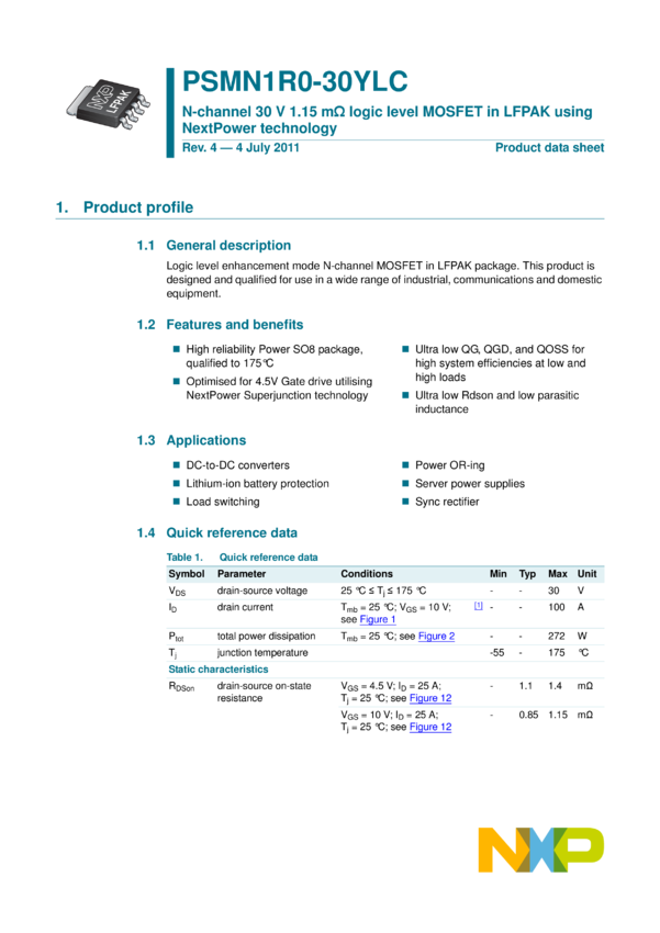 N-channel 30 V 1.15 mΩ logic level MOSFET in LFPAK using NextPower technology