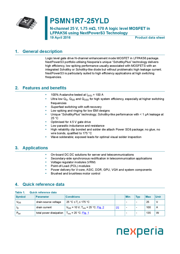 N-channel 25 V, 1.75 mΩ, 170 A logic level MOSFET in LFPAK56 using NextPowerS3 Technology