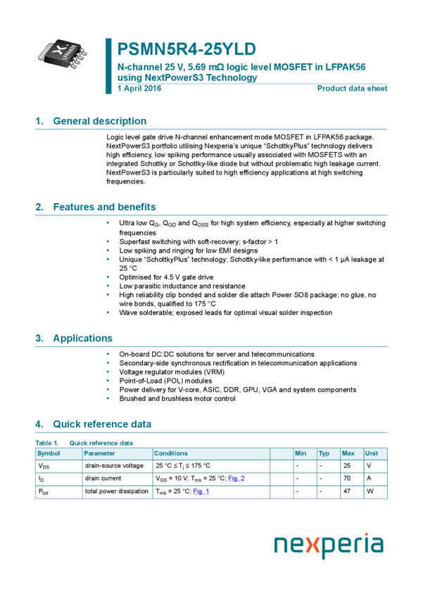 N-channel 25 V, 0.7 mΩ logic level MOSFET in LFPAK56 using NextPowerS3 Technology