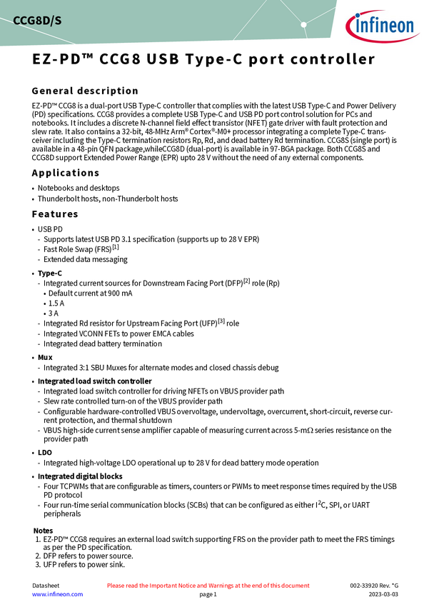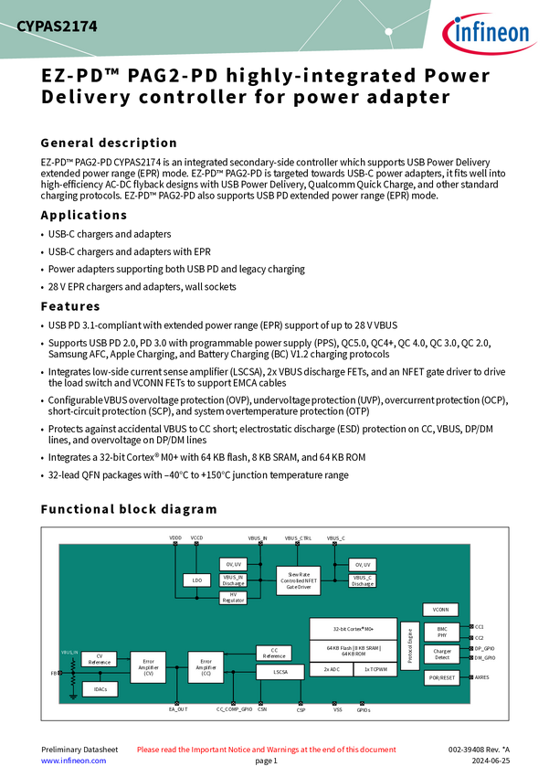 Highly integrated PD controller for SPR and EPR AC/DC chargers and adapter design, tape and reel packing EZ-PD™ PAG2-PD is a highly integrated USB-C PD controller that complies with the latest USB type-C and PD standards and is designed for power adapters and chargers. It offers a significant BOM advantage by integrating all type-C port termination resistors, 34 V-tolerant regulators, a high voltage VBUS NFET gate driver, VBUS fault protections, VBUS to CC short protection, and an integrated feedback circu
