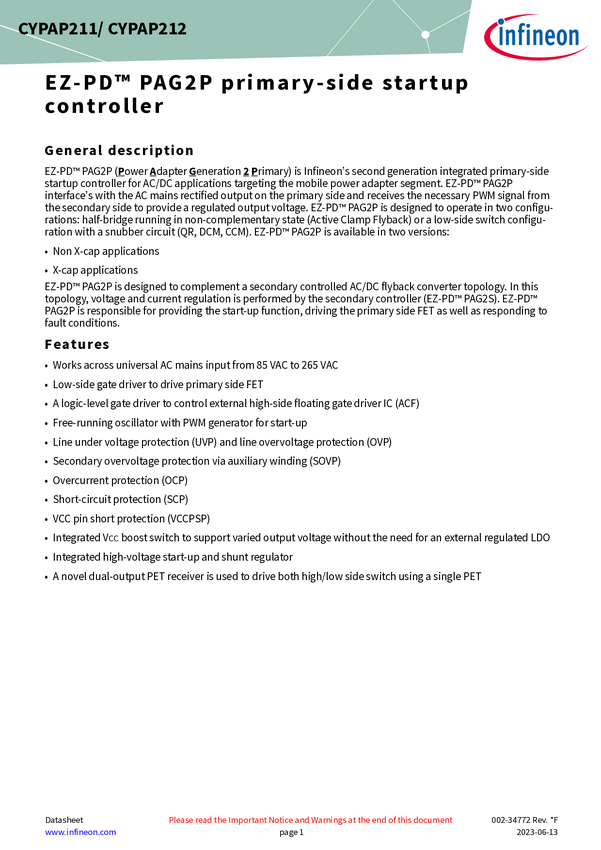 Secondary-side controlled primary start-up controller with x-cap discharge mode EZ-PD™ PAG2P provides the HV start-up function, PET receiver, low-side NFET gate driver, high-side logical level driver, and fault protections.