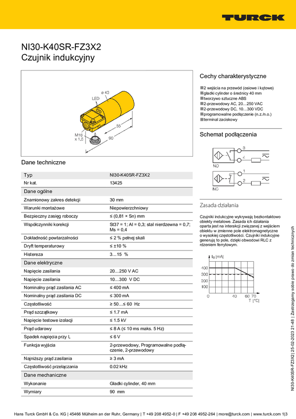 Turck Czujnik indukcyjny nie podtynkowy NI30-K40SR-FZ3X2