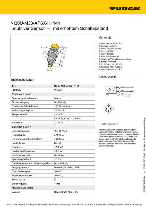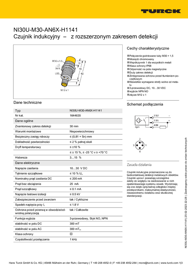 Turck Czujnik indukcyjny nie podtynkowy PNP, Zamykający NI30U-M30-AP6X-H1141