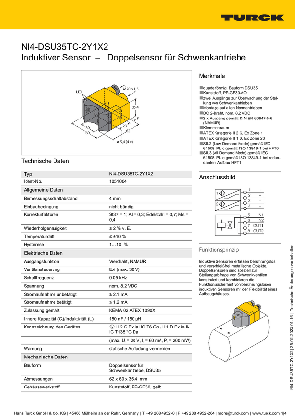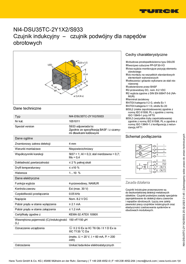 Turck Czujnik indukcyjny nie podtynkowy NAMUR NI4-DSU35TC-2Y1X2