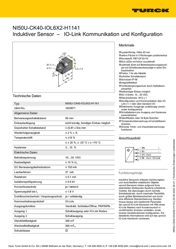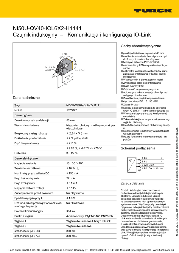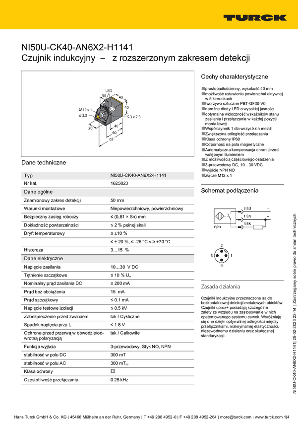Turck Czujnik indukcyjny nie podtynkowy PNP, Zamykający NI50U-CK40-AP6X2-H1141