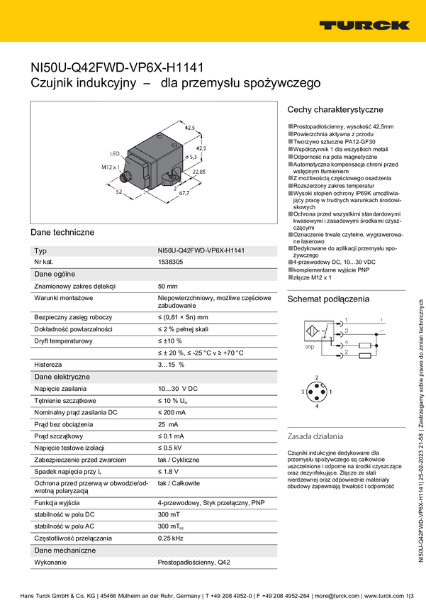 Turck Czujnik indukcyjny nie podtynkowy PNP, Przełącznik Ni50U-Q42FWD-VP6X-H1141