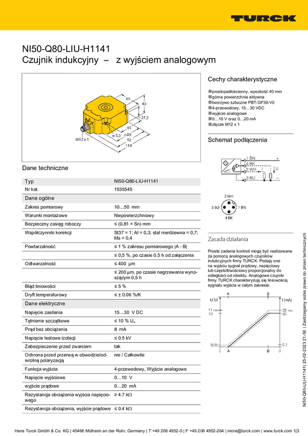 Turck Czujnik indukcyjny nie podtynkowy NI50-Q80-LIU-H1141