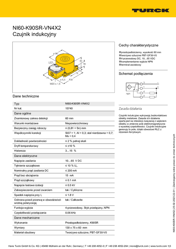 Turck Czujnik indukcyjny nie podtynkowy PNP, Przełącznik NI60-K90SR-VP4X2