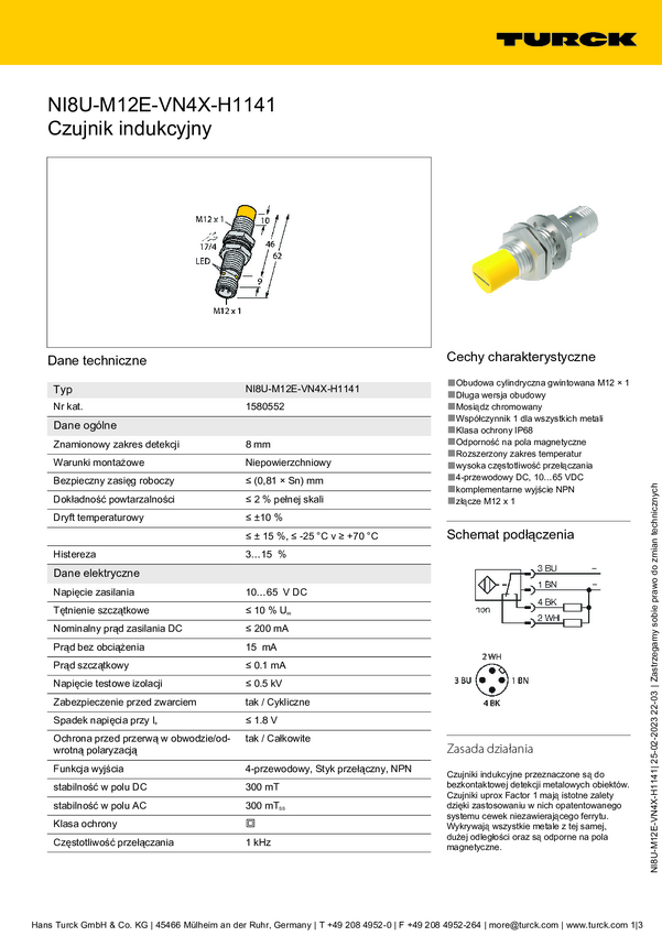 Turck Czujnik indukcyjny nie podtynkowy PNP, Przełącznik NI8U-MT12E-VP4X-H1141