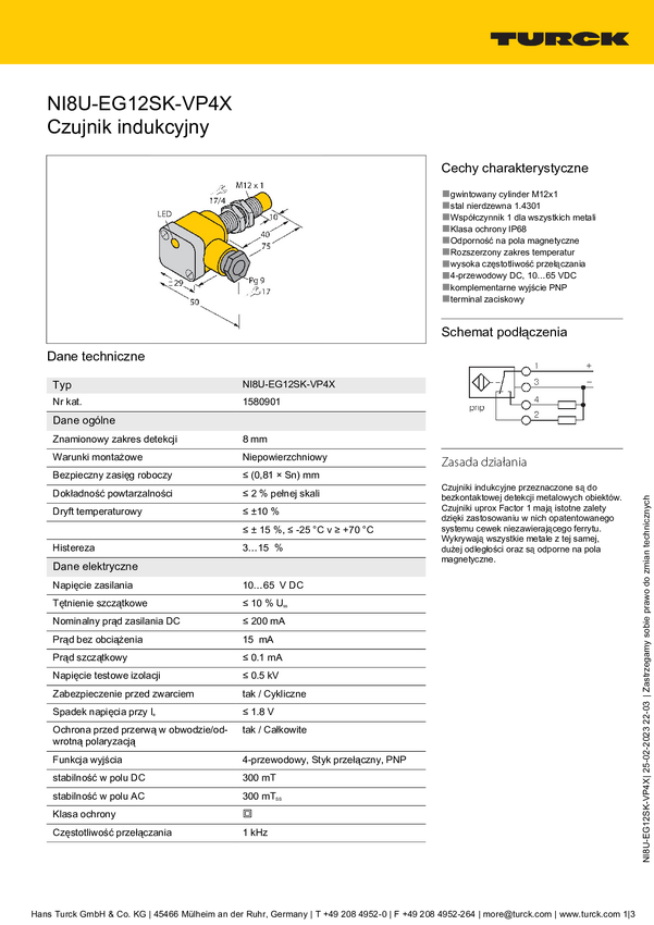 Turck Czujnik indukcyjny nie podtynkowy PNP, Przełącznik NI8U-EG12SK-VP4X