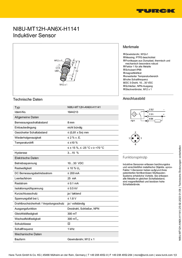 Turck Czujnik indukcyjny nie podtynkowy PNP, Zamykający NI8U-MT12H-AP6X-H1141