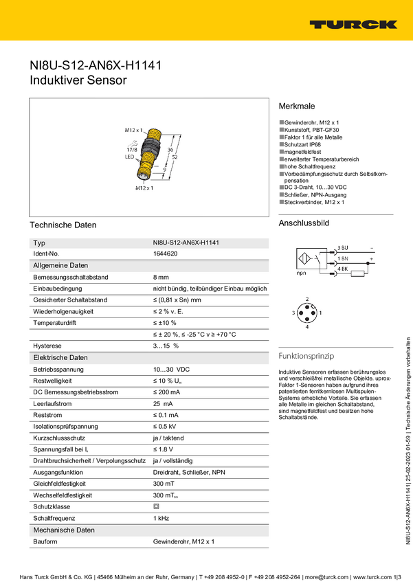 Turck Czujnik indukcyjny nie podtynkowy PNP, Zamykający NI8U-S12-AP6X-H1141