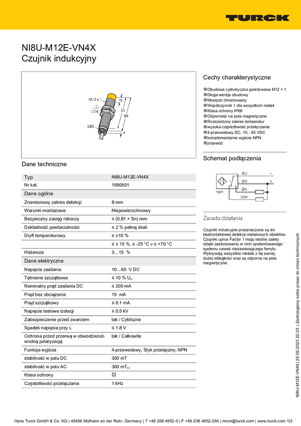 Turck Czujnik indukcyjny nie podtynkowy PNP, Zamykający NI8U-EM12-AP6X