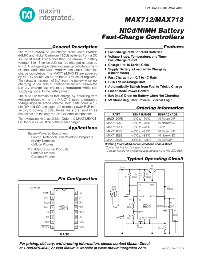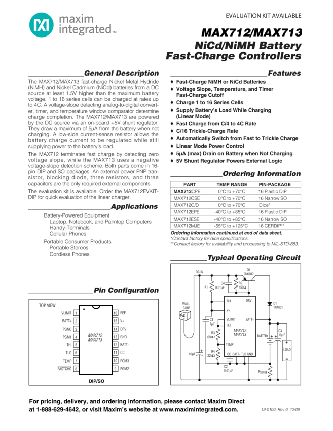MAX712, MAX713 NiCd/NiMH Battery Fast-Charge Controllers