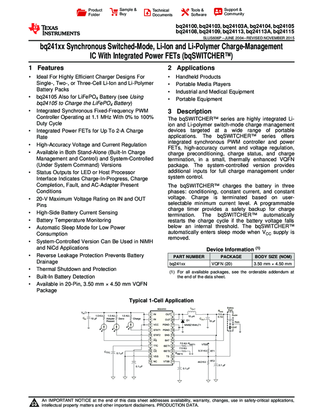 Switch Mode Charger Li-Ion/Li-Pol/NiMH/NiCD Packs 150mA to 2000mA 2.1V to 15.5V 20-Pin VQFN EP T/R