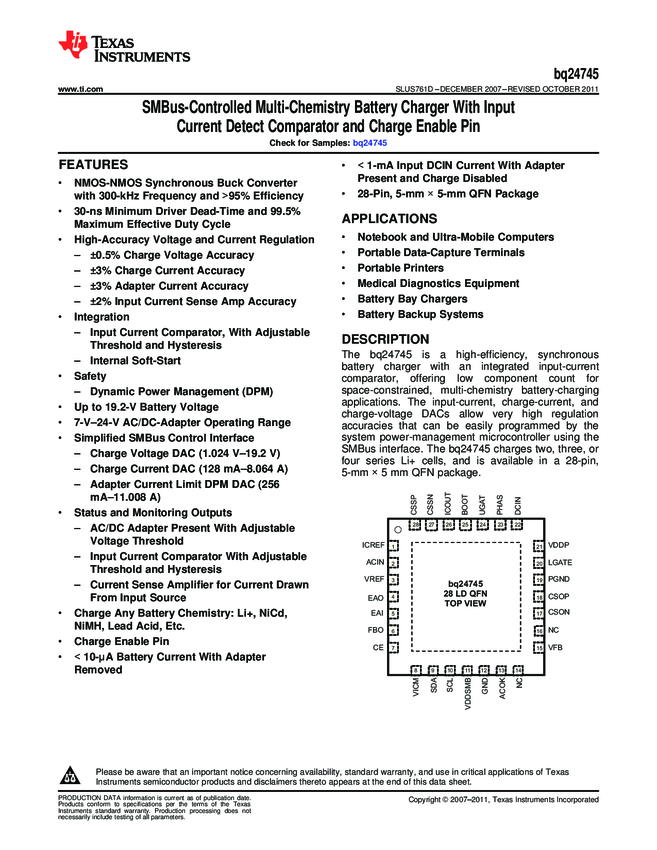 Battery Charger Lead-Acid/Li-Ion/Li-Pol/NiCD/NiMH 128mA to 8064mA 1.024V to 19.2V 28-Pin VQFN EP T/R