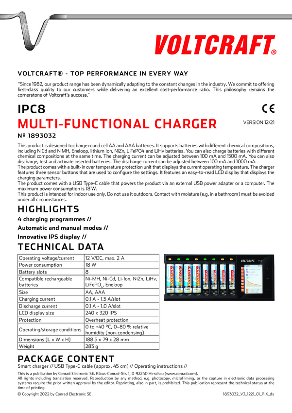 Ładowarka do akumulatorów VOLTCRAFT IPC-8 + HR03 SE + HR6 SE NiMH, NiCd, NiZn, LiIon, LiHV, LiFePO