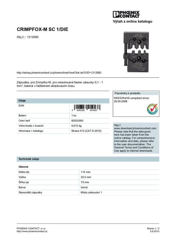 Phoenix Contact CRIMPFOX-M SC 1/DIE 1212083 Matryca do zaciskarki złącze żeńskie płaskie, nieizolowane 0.1 do 1 mm² Komp