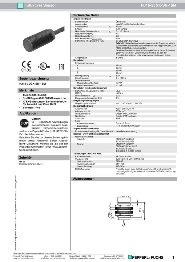 Pepperl+Fuchs Czujnik indukcyjny NAMUR NJ15-30GK-N-20M x2xG1xxD