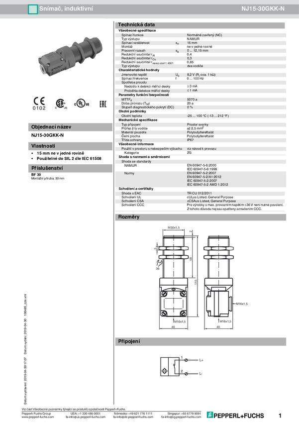 Czujnik indukcyjny Pepperl+Fuchs NJ15-30GK-N x2xG1xxD 70133317 1 szt.