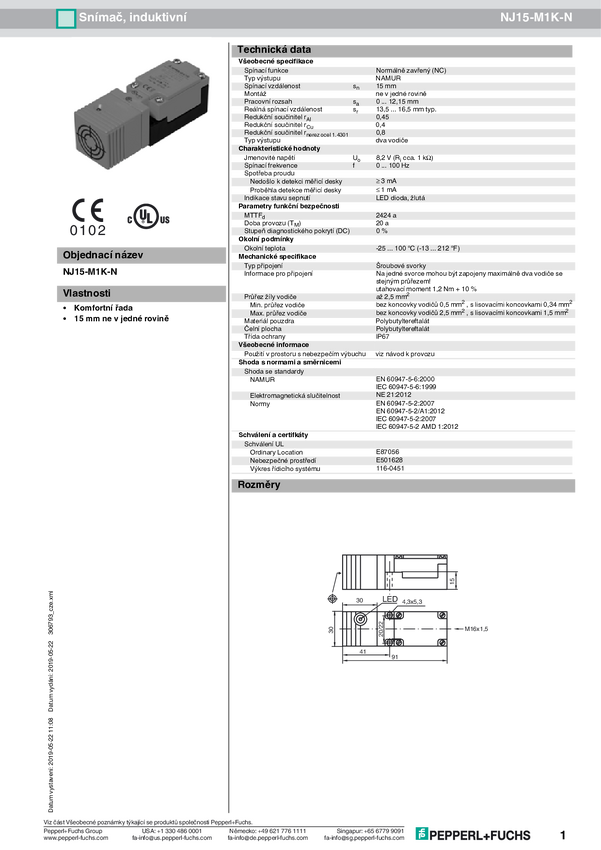 Czujnik indukcyjny Pepperl+Fuchs NJ15S+U1+N 12xG1xxD 70133115 1 szt.