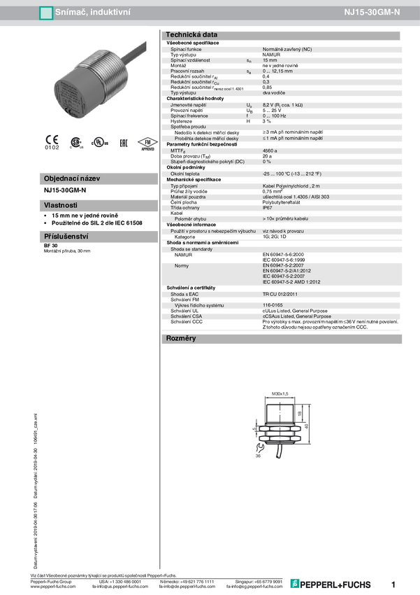Pepperl+Fuchs Czujnik indukcyjny NAMUR NJ15-30GM-N-10M 12xG1xxD