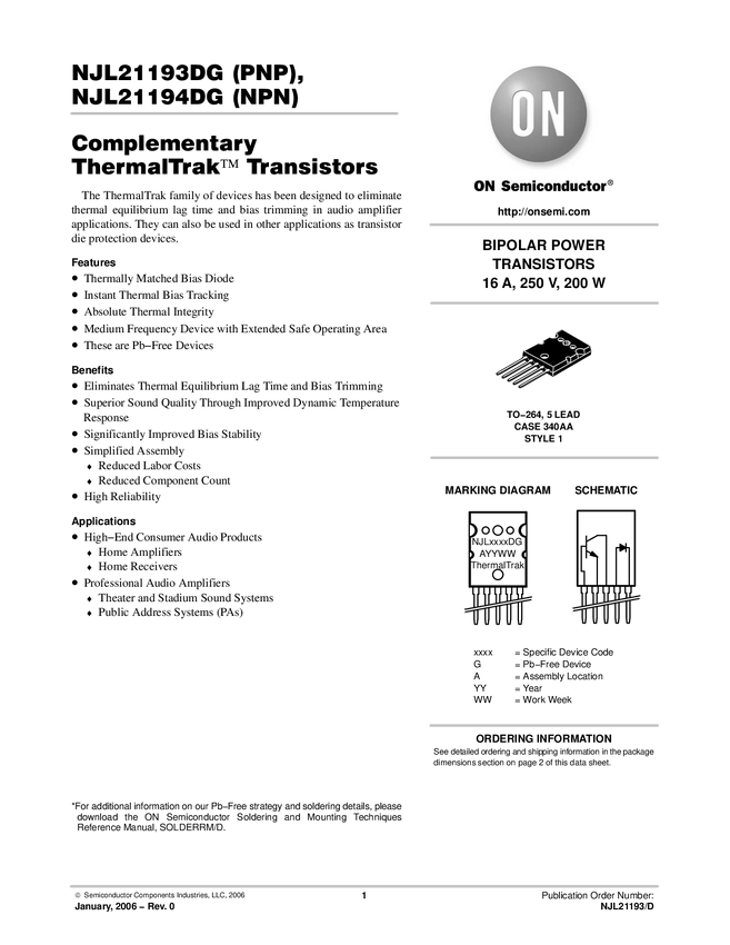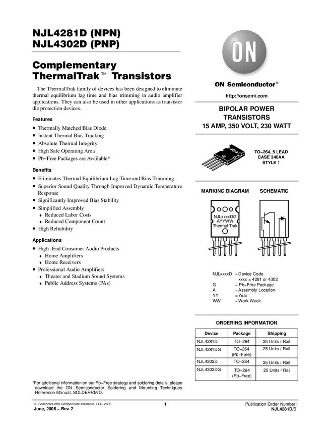 Bipolar Power Transistor, PNP, ThermalTrak™, 15 A, 260 V