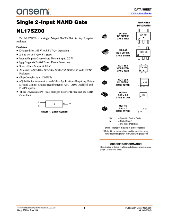 Układ scalony; NL17SZ00DFT2G; bramka logiczna; NAND; 2 wejścia;1 wyjście; 1 kanał; 1,65-5,5V; 32mA; SC-70; SMD; RoHS; op/100szt