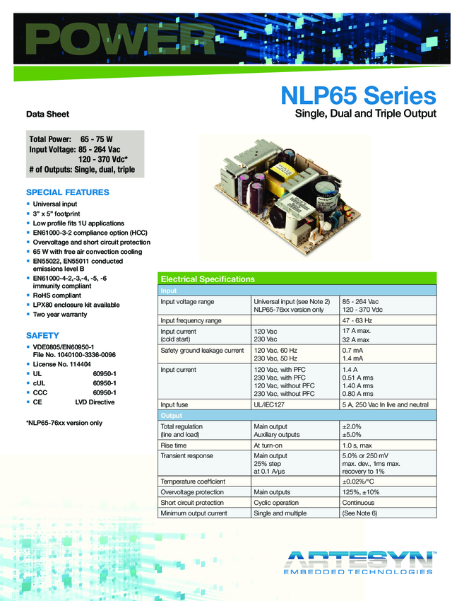 AC/DC Power Supply Single-OUT 24V 2.7A 65W 10-Pin