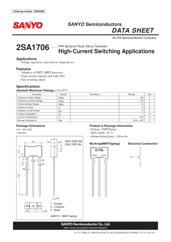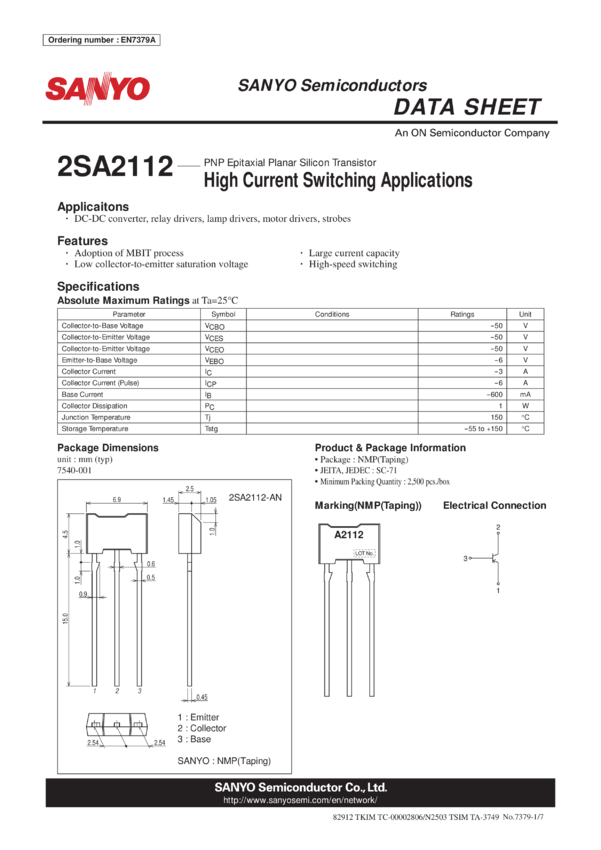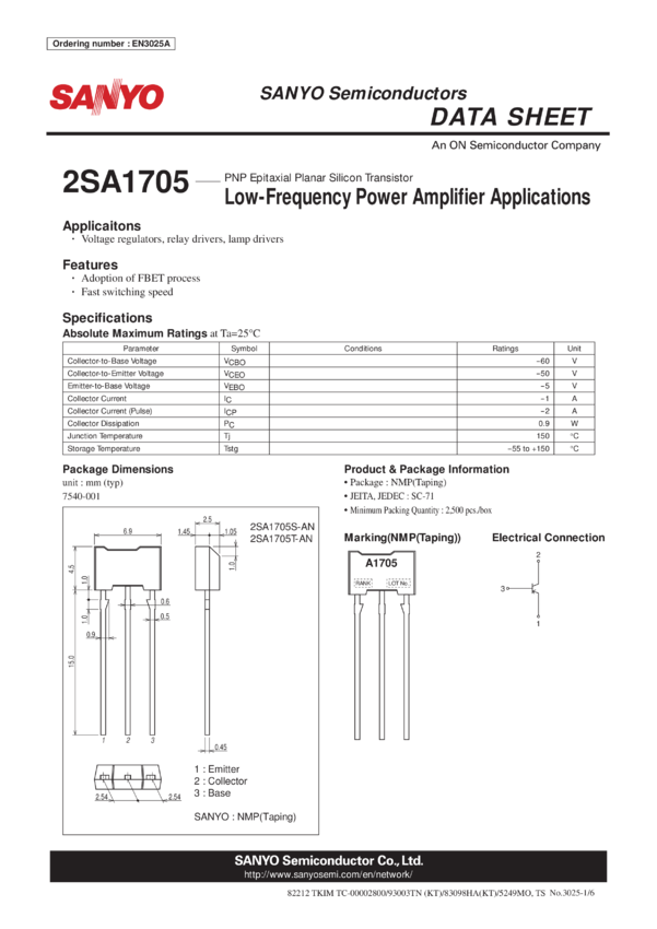 Bipolar Transistor -50V -1A VCE(sat);-500mV max. PNP Single NMP
