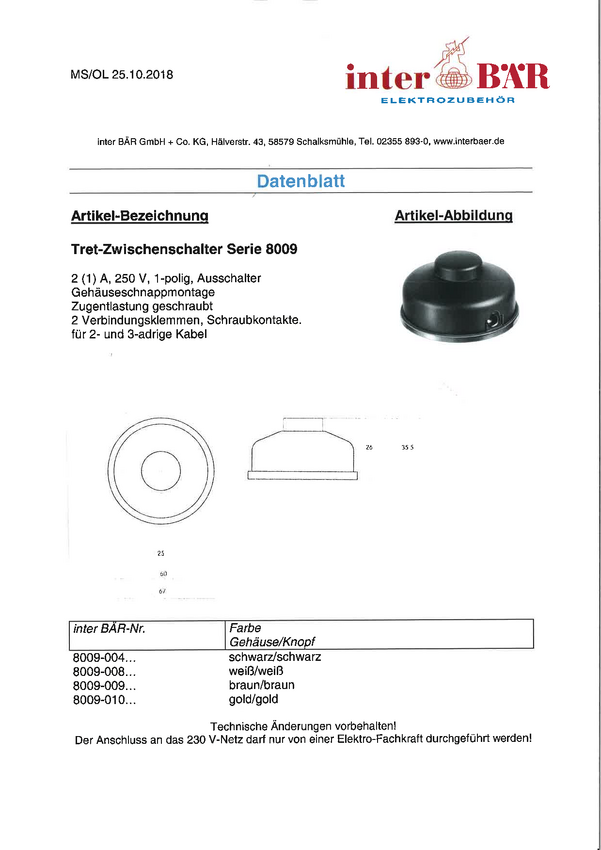 Bachmann 924064 Wyłącznik nożny brązowy 1 szt.