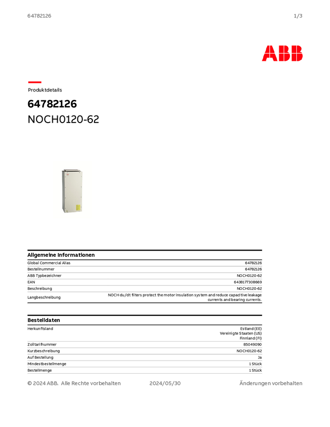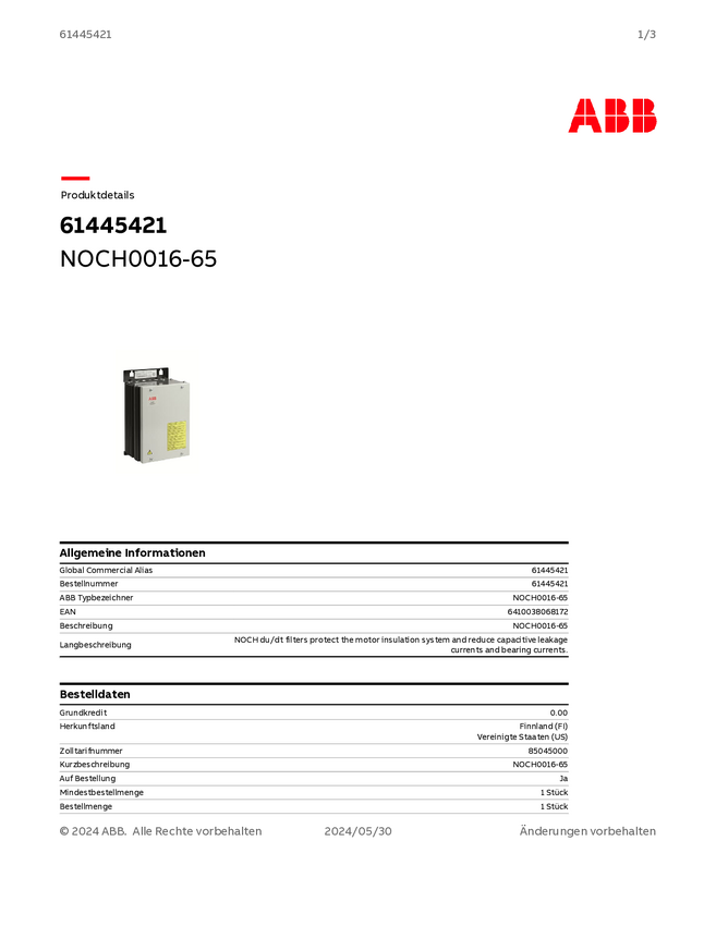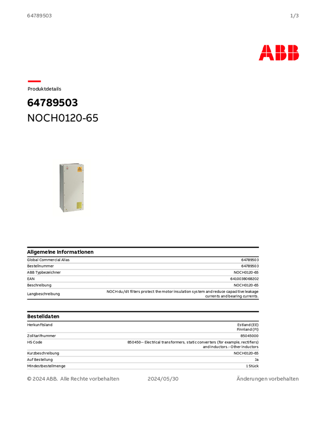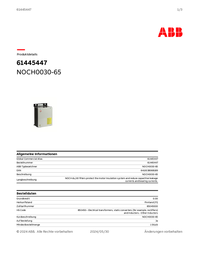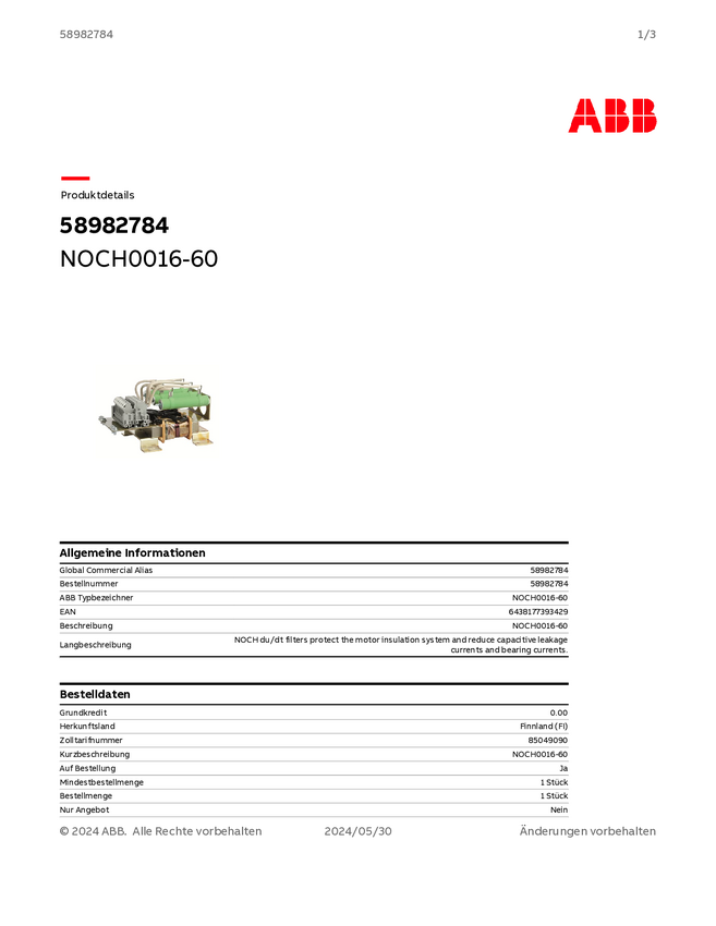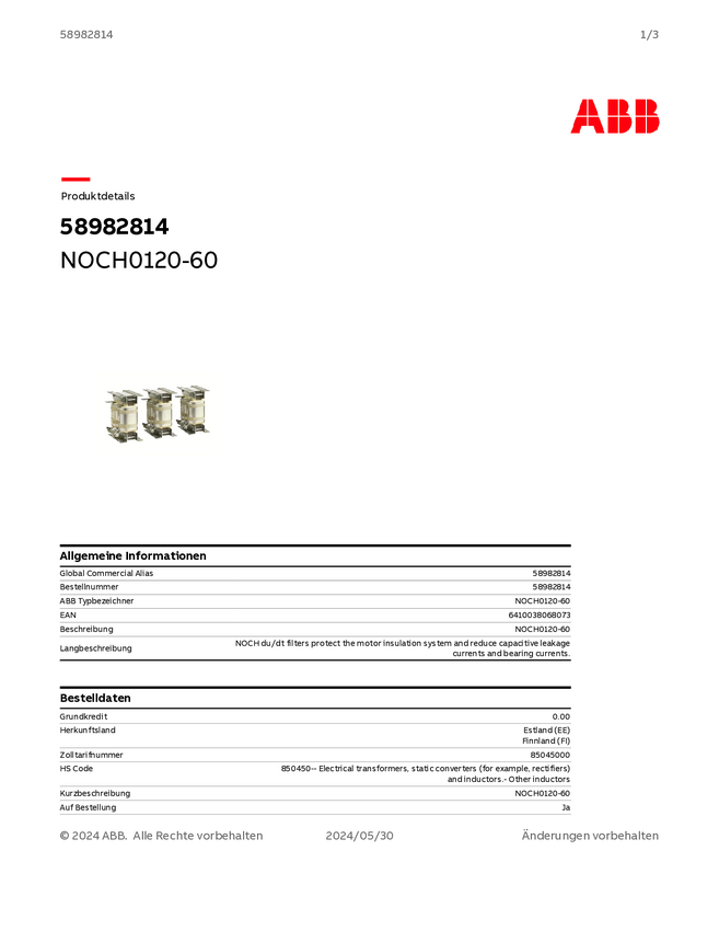Dławik wyjściowy ABB NOCH0030-60 DU/DT
