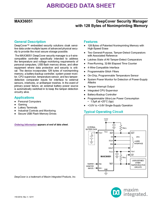 MAX36051 DeepCover Security Manager with 128 Bytes of Nonimprinting Memory