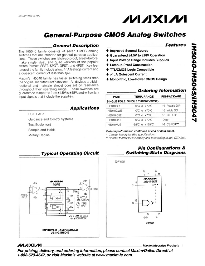 SPST, Normally Open, CMOS Analog Switch