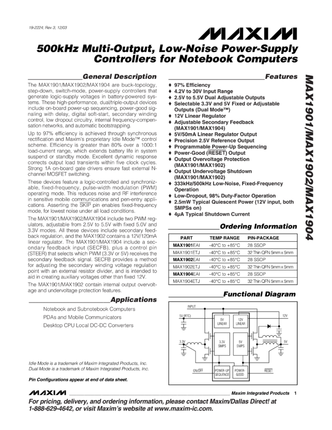 MAX1901, MAX1902, MAX1904 500kHz Multi-Output, Low-Noise Power-Supply Controllers for Notebook Computers