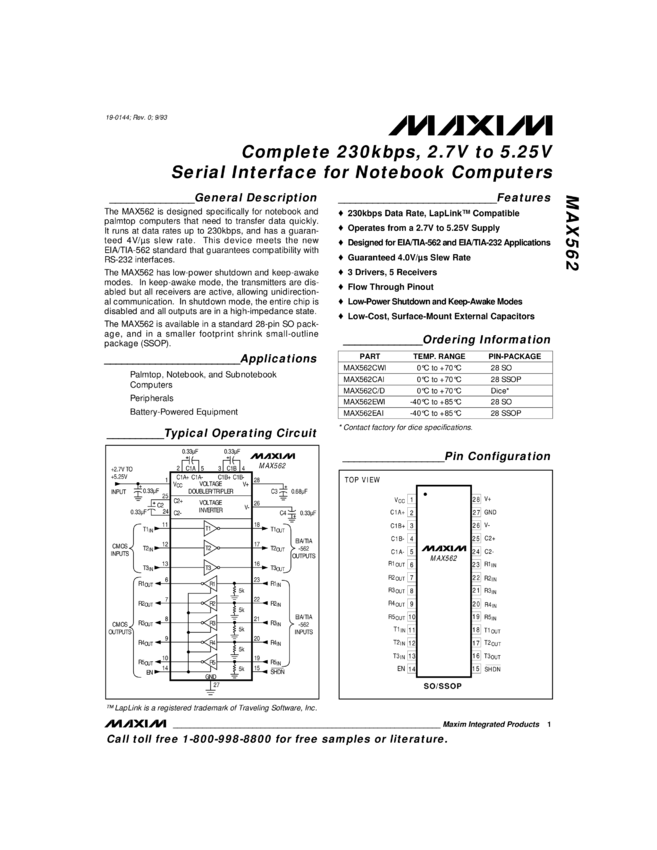 MAX562 Complete 230kbps, 2.7V to 5.25V Serial Interface for Notebook Computers