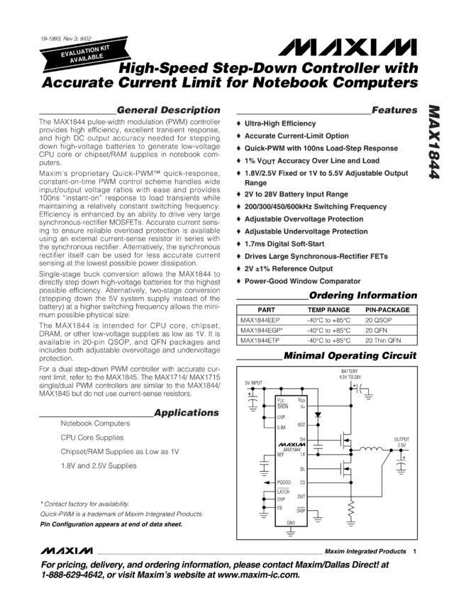 MAX1844 High-Speed Step-Down Controller with Accurate Current Limit for Notebook Computers