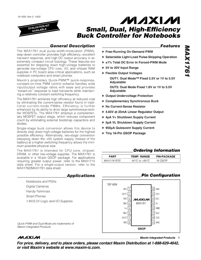 MAX1761 Small, Dual, High-Efficiency Buck Controller for Notebooks