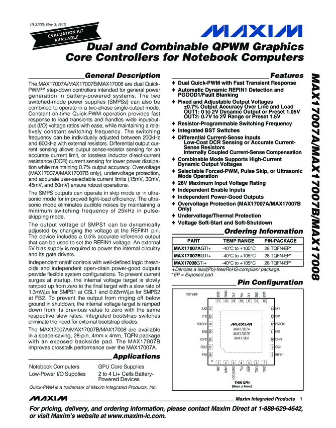 MAX17007A, MAX17007B, MAX17008 Dual and Combinable QPWM Graphics Core Controllers for Notebook Computers