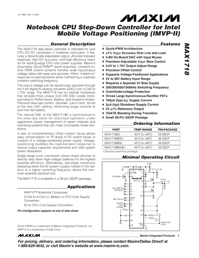 MAX1718 Notebook CPU Step-Down Controller for Intel Mobile Voltage Positioning (IMVP-II)
