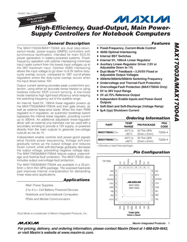 MAX17003A, MAX17004A High-Efficiency, Quad Output, Main Power-Supply Controllers for Notebook Computers