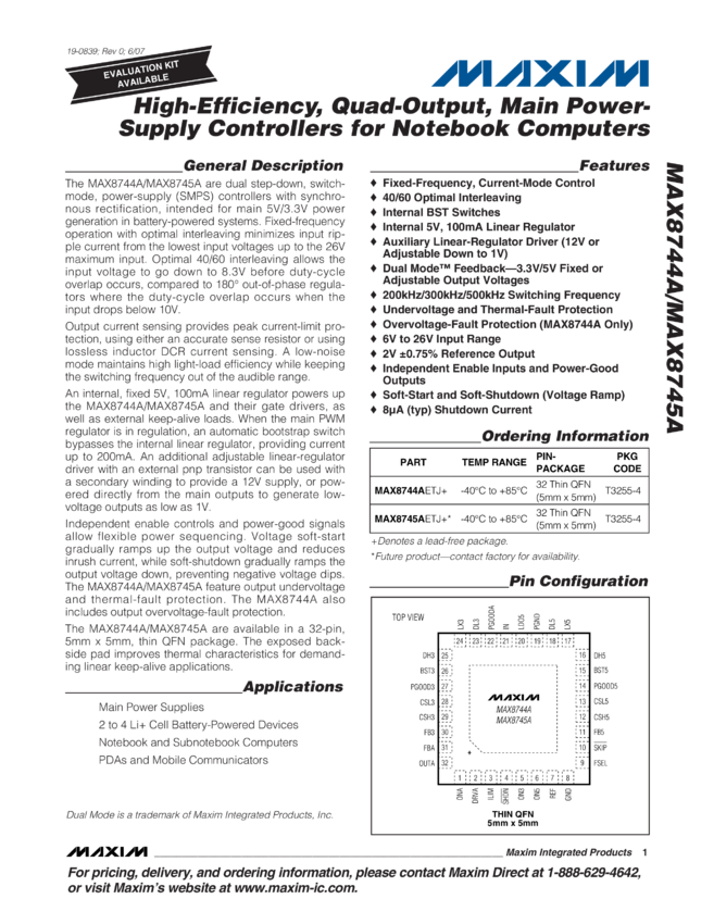 MAX8744A, MAX8745A High-Efficiency, Quad Output, Main Power-Supply Controllers for Notebook Computers