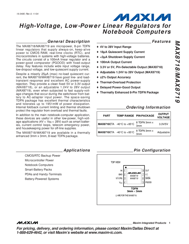 MAX8718, MAX8719 High-Voltage, Low-Power Linear Regulators for Notebook Computers