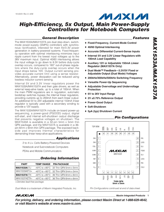 MAX1533A, MAX1537A High-Efficiency, 5x Output, Main Power-Supply Controllers for Notebook Computers