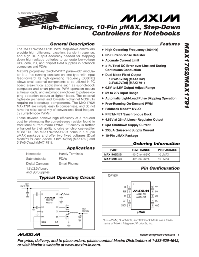 MAX1762, MAX1791 High-Efficiency, 10-Pin µMAX, Step-Down Controllers for Notebooks