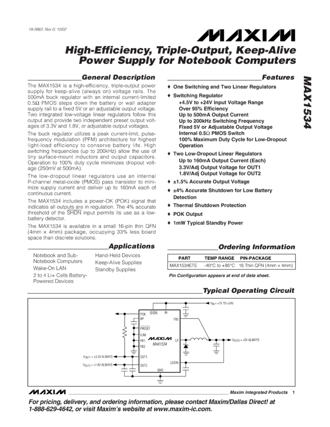 MAX1534, MAX1534ETE High-Efficiency, Triple-Output, Keep-Alive Power Supply for Notebook Computers