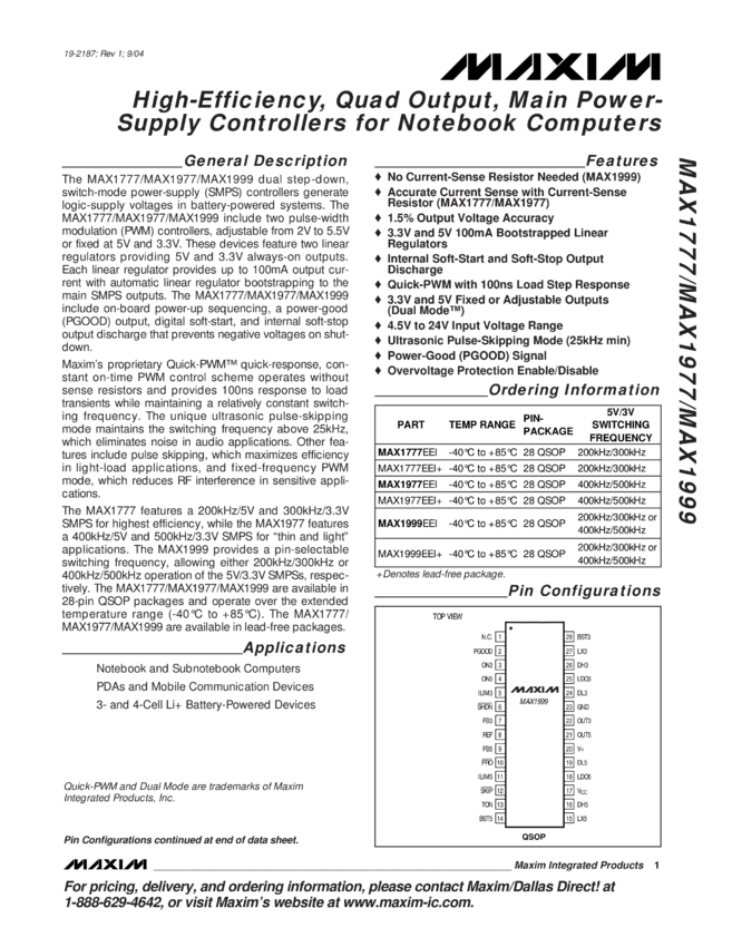 MAX1777, MAX1977, MAX1999 High-Efficiency, Quad Output, Main Power-Supply Controllers for Notebook Computers