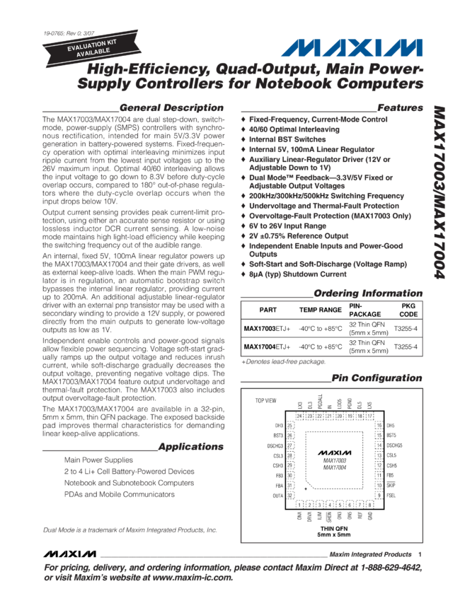 MAX17003, MAX17004 High-Efficiency, Quad Output, Main Power-Supply Controllers for Notebook Computers