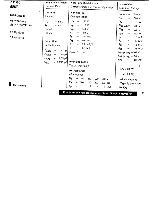 Lampa elektronowa EF EF 86 = 6267 = 6 CF 8 BTB Vertrieb EF 86 = 6267 = 6 CF 8 Ilość styków 9 Trzonek Noval Opis: Pentoda